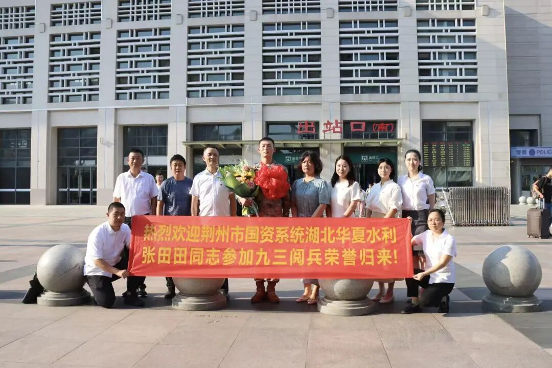 9月4日下午,張田田同志載譽歸來。荊州市退役軍人事務局副局長李荊鳳,荊州市政府國資委黨委委員、副主任童克忠、黨委委員、副主任嚴珩,湖北華夏水利黨委書記、董事長張澤武一行來到荊州火車站熱情迎接。